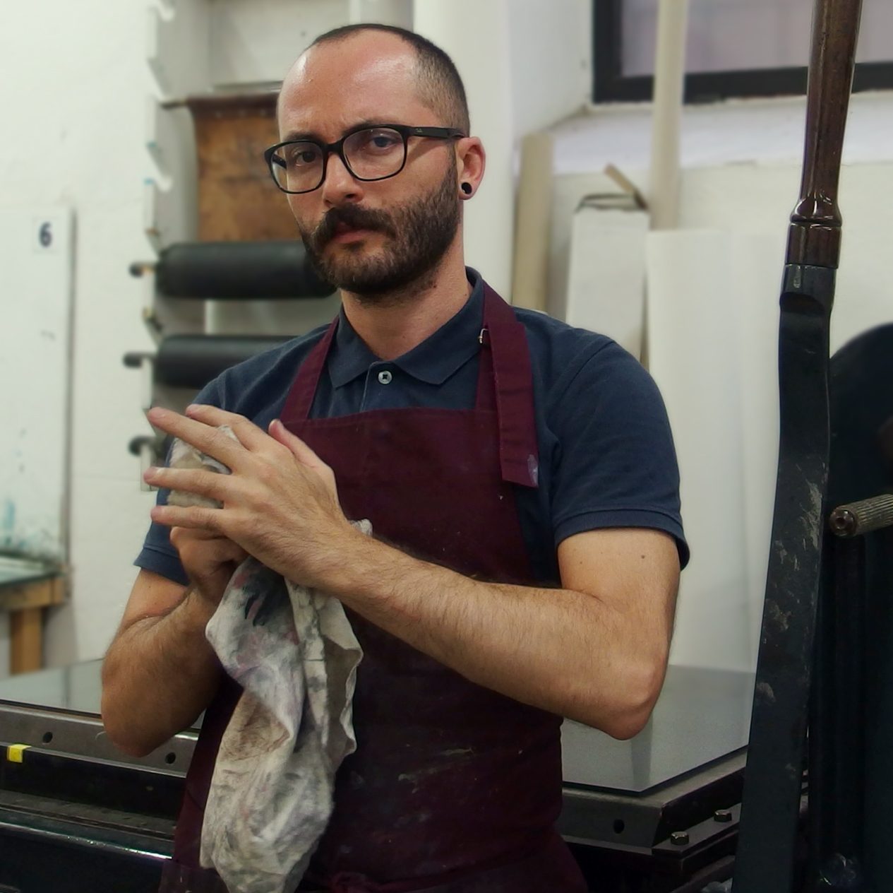 Raffaele (Gerbera) Sarcina was born in Canosa di Puglia, Italy, in 1987. He graduated in Graphics at Academy of Fine Arts of Foggia and than in Academy of Fine Arts of Bari. Courrently lives in Barcelona (Spain) working as manager of EINA (Centre Universitari de Disseny i Art de Barcelona) graphic techniques laboratory. Exibitions: collective Open Art 20X20 at La Maldita Estampa (Barcelona) 2021, Amalgama Grafica III Internacional Contemporanea at La Maldita Estampa, 2020; solo exibition “Der Doppelganger”, a series of illustrations in etching, aquotint, mezzotint and screenprinting about uncanny figure of Double in 2017 at the EINA Espai Barra de Ferro (EINA); collective “Urban gallery” at the Foggia’s Pinacoteca 900 in 2015; collective at the International art festival “ Ruid al sud ” at the Bari’s Mediateca Regionale, 2015; collective “Logiche dello spazio” at Studio 52 in Altamura (BA, Italy), 2015; winner in the First Biennial of Contemporary Art of Salerno Youth 2014 Painting section“; Globe Glotter Trinitapoli ” exibition (BT, Italy), 2010. Various the private commissions.
